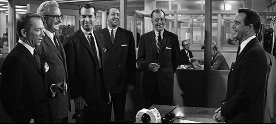 La storia si apre con la descrizione dei numeri dell’azienda, e dello stipendio del protagonista: come se Wilder ci volesse subito mostrare la dimensione da paraocchi omologante del mondo moderno. Nel piano del palazzo dove lavora Baxter gli uomini sono uno accanto all’altro, schierati come in un allevamento intensivo, senza nient’altro che possa distrarre.