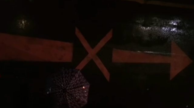 Il giorno del quarto compleanno di sua figlia, nel cuore della notte, Oh Dae-Su viene infatti rapito da un uomo con il volto coperto da un ombrello viola – colore che rappresenta emblematicamente il mistero. La macchina da presa a questo punto indugia nell’inquadrare l’asfalto bagnato sul quale risalta una freccia segnata da una x, precisamente laddove si trova l’uomo misterioso.