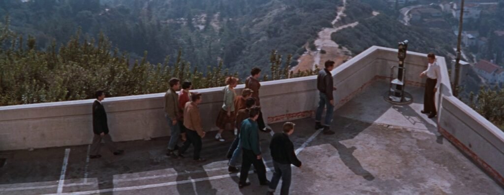 Un altro tema fondamentale del film è, infatti, quello del vivere sull’orlo del precipizio. In tutta la pellicola si avverte la sensazione che il malessere non sfogato e non capito possa portare a una tragedia in qualsiasi momento. Qualche scena prima, infatti, Buzz ha sfidato con un coltello Jim sull’orlo di un altro precipizio, questa volta in cima al planetario della città, l’ennesimo richiamo, tra l’altro, all’oscurità e alla notte.