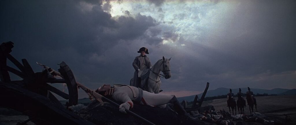 In Guerra e pace, il principe Andrej si trova a un certo punto invischiato e perdente nell’immane ecatombe di Austerlitz. Ferito e con l’asta della bandiera forse solo involontariamente ancora in mano, scorge un arrogante Napoleone dispensare ordini ai suoi uomini mentre onora i caduti di ogni parte, anche loro piena celebrazione del suo più immenso trionfo. E quando viene il turno di Andrej, e la sua barella è issata dalle guardie imperiali, sdraiato in quella posizione Bonaparte gli appare piccolissimo, poiché si staglia alle sue spalle un cielo alto e sublime il cui sfondo rende insignificante persino l’empereur al culmine del suo potere.