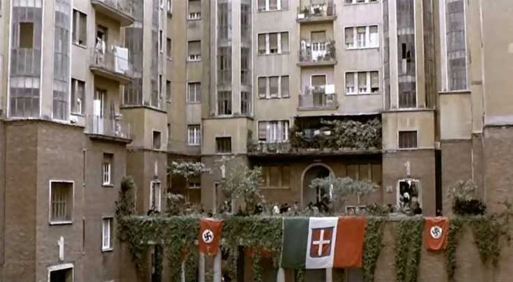 Una giornata particolare si apre con sei minuti di cinegiornale de Il viaggio del Führer in Italia, facendoci varcare la soglia verso un passato non troppo lontano: la fine della prima giornata di Hitler nella Città Eterna dà appuntamento all’indomani, 6 maggio 1938, per assistere alla parata dell’esercito italiano insieme al Führer. “Nessun romano mancherà allo storico evento“, sentenzia la voce iperbolica di Guido Notari. La farsa mussoliniana inizia già qui, perché scopriremo presto che a non tutti gli italiani sarà davvero permesso partecipare. La bandiera nazista sventola a pieno campo e i colori si ingialliscono nell’atmosfera seppiata che caratterizzerà il film; la macchina da presa svela il lento risveglio di un condominio di Roma. Non un condominio qualunque, ma Palazzi Federici, uno dei primi esempi di associazione tra Stato e privato, il cui giardino è ricorda l’ingresso di un formicaio ben organizzato: