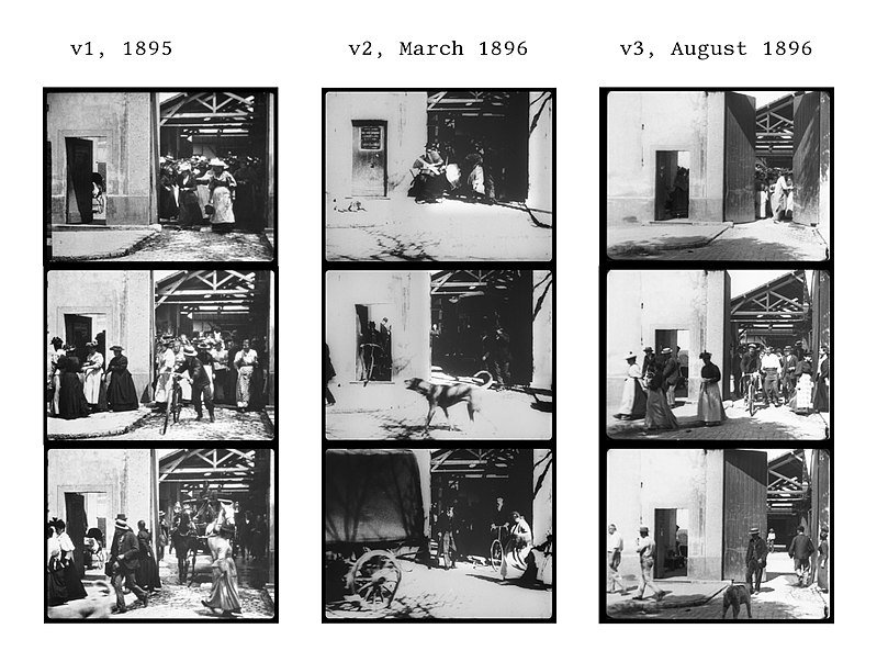 Il primo, L’uscita dalle officine Lumière, inquadra un gruppo di figure anonime di operai che, nell’uscire dall’officina, saturano uno spazio prima vuoto e così anche l’immagine stessa, all’interno della cornice circolare dell’apertura iniziale e chiusura finale delle porte della fabbrica. Come un teatro. O una finestra.