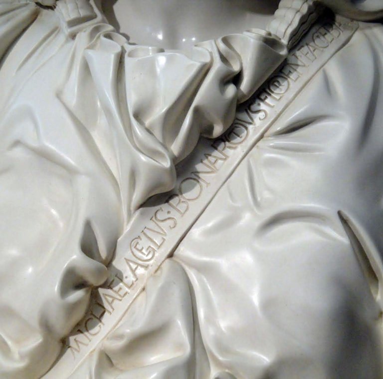 Eppure, era stato lo stesso Michelangelo Buonarroti ad aver sostenuto l’idea dell’eterna perfettibilità dell’arte, proprio scegliendo, attraverso un topos delle firme dei latini che avrebbe poi avuto nuovamente largo corso nel Cinquecento, il verbo faciebat (imperfetto latino) al posto del tempo perfetto e compiuto fecit, per la scritta scolpita sulla fusciacca della Vergine, nell’unica sua opera firmata: la Pietà Vaticana (1498-99).