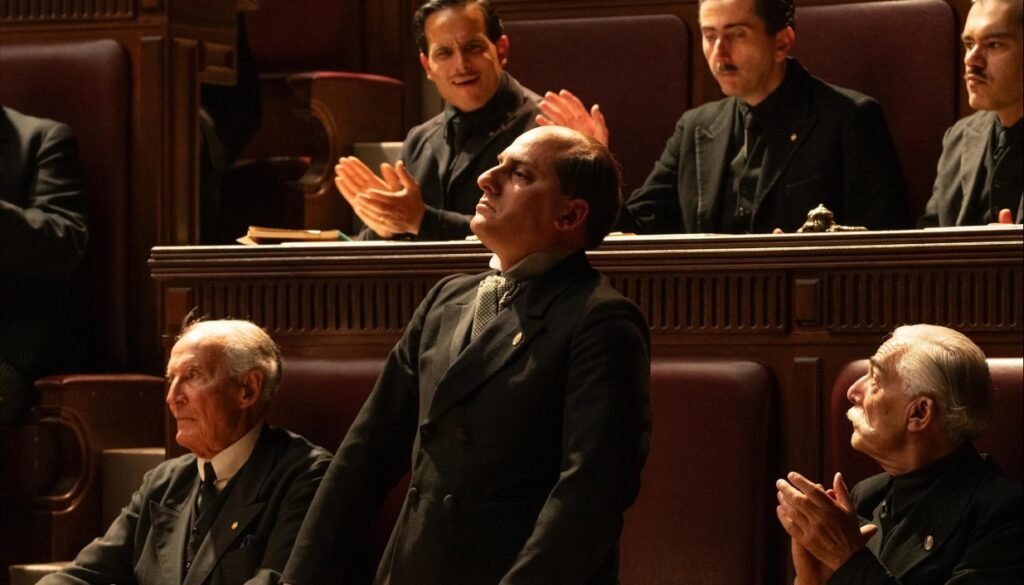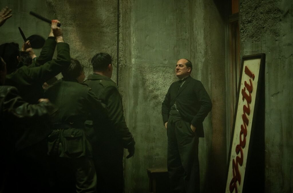 Entrambi storicamente rappresentati come al di sopra delle emozioni si ritrovano in balia degli eventi. Emblematica è la scena in cui Mussolini insegue Cesare Forni, ribelle squadrista che non si rivede più nel partito. Joe Wright sfrutta la coreografia per raccontarci la debolezza di Mussolini. Sempre lo abbiamo visto con il petto villoso e gonfio, fieramente diritto e la mascella ferma. Vederlo così, seduto e debole dinanzi a un suo adepto, afflitto dalla paura della morte, altro non è che il momento della caduta di una divinità. Fragorosa. Tremebonda per sua definizione.